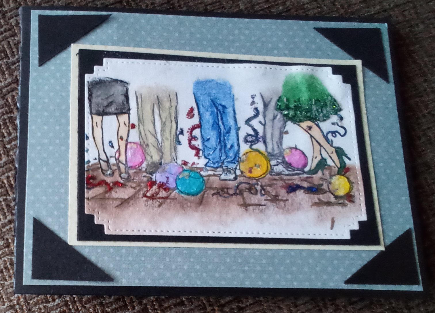 The set I chose to use was lovely legs happy new year. I thought the image would make a good birthday card or an invitation for a party as if well as a New Years card. On my card I used the same base black silk skin paper I used for my daughters wedding invites. I also used flat enamels on some of the balloons and of course Stickles to pump up the shine factors. I also colored the images with colored pencils and copics on the skin. Here are my cards:
